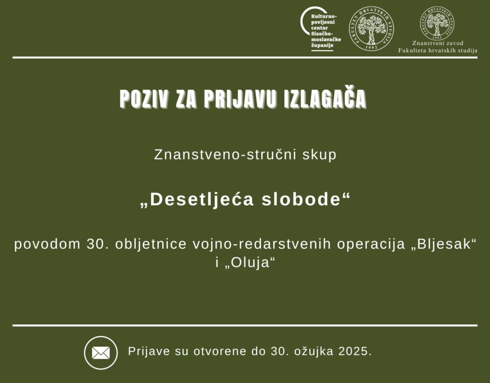 Kulturno-povijesni centar Sisačko-moslavačke županije u suradnji s Fakultetom hrvatskih studija i Znanstvenim zavodom Fakulteta hrvatskih studija organizira Znanstveno-stručni skup „Desetljeća slobode“ povodom tridesete obljetnice uspješne provedbe vojno-redarstvenih operacija […]