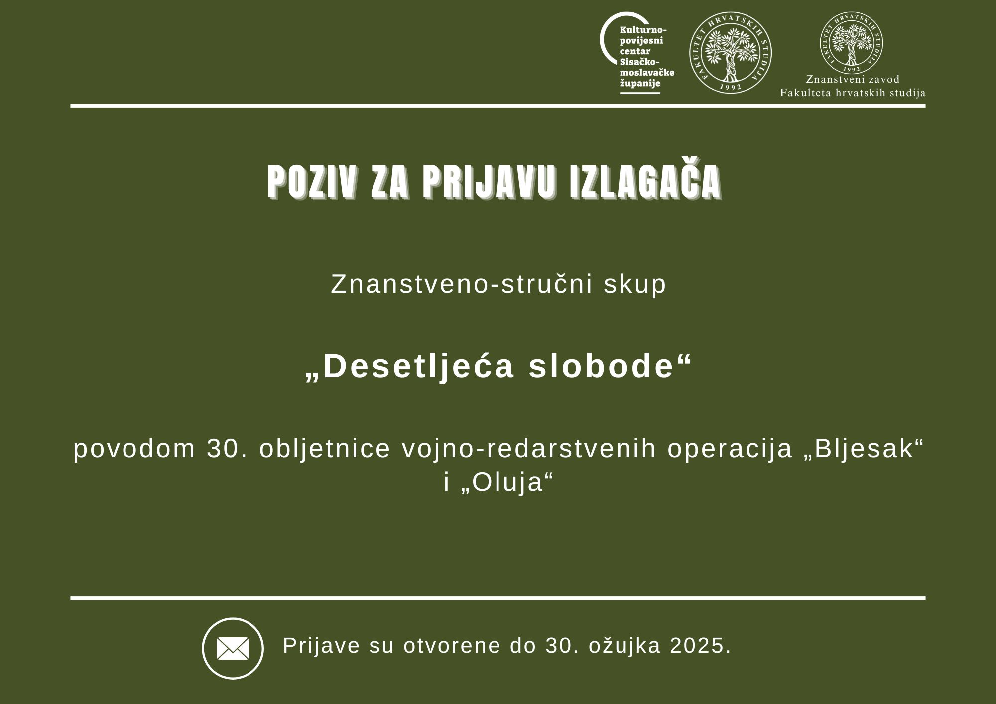 Kulturno-povijesni centar Sisačko-moslavačke županije u suradnji s Fakultetom hrvatskih studija i Znanstvenim zavodom Fakulteta hrvatskih studija organizira Znanstveno-stručni skup „Desetljeća slobode“ povodom tridesete obljetnice uspješne provedbe vojno-redarstvenih operacija […]